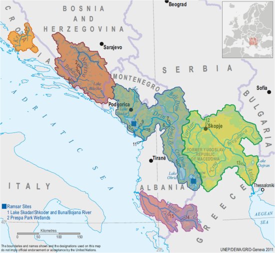 Na mapie zaznaczono pięć obszarów dorzeczy bałkańskich, m.in. Drinu oraz Wardaru