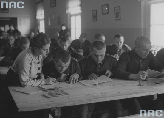 Żołnierze 21 Warszawskiego Pułku Piechoty „Dzieci Warszawy" podczas nauki czytania, prowadzonej przez Polski Biały Krzyż. Z archiwum Narodowego Archiwum Cyfrowego