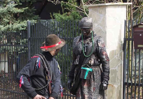 językiem, u pasa zawsze nieodstępny garnek, służący równie do okadzania od