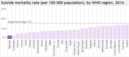 Często pisze się, że wysoki poziom samobójstw to specyfika krajów postsowieckich, jednak ogólny poziom samobójstw nie ma wiele wspólnego z podziałem na wschód i zachód. Według danych WHO to właśnie byłe republiki i kraje bloku wschodniego przodują w Europie z najniższymi poziomami samobójstw: Tadżykistan 2,5, Azerbejdżan 2,6, Albania 6,3, Armenia 6,6, Turkmenistan 6,7, Uzbekistan 7,4, Macedonia 7,9, Gruzja 8,2, Kirgistan 8,3, Bośnia i Hercegowina 8,8, Czarnogóra 10,3, Rumunia 10,4, Bułgaria 11,5 — kraje zachodnie mają wyższy poziom. Nie można przy tym pisać, że ten niski poziom samobójstw części byłych republik wynika np. z islamu, bo