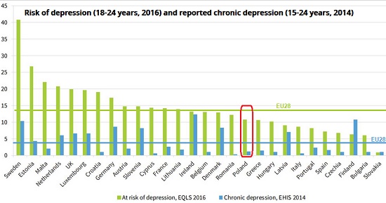 „Polscy uczniowie królują, ale w liczbie prób samobójczych i przypadków dziecięcej depresji!!" Nieprawda. Według danych UE polscy nastolatkowie są jednymi z najmniej depresyjnych, znacznie poniżej unijnej średniej.