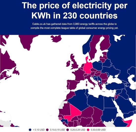 Analitycy Cable.co.uk przez sześć ostatnich miesięcy analizowali taryfy energetyczne w 230 krajach i ceny prądu. Jakie są wnioski z tabeli cen energii energetycznej na świecie? Najtaniej prąd kupimy w Libii, gdzie kosztuje on mniej niż cent za kWh. To dziedzictwo Kaddafiego. Na drugim końcu skali są Wyspy Salomona, gdzie prąd jest droższy 99 razy w porównaniu z Libią. W Europie najwyższe ceny mają Niemcy, gdzie są one zbliżone do krajów Afryki Subsacharyjskiej. Polska znajduje się zaś w tańszej połowie stawki całego świata i niemal najtańszej w Europie. [ 1 ]