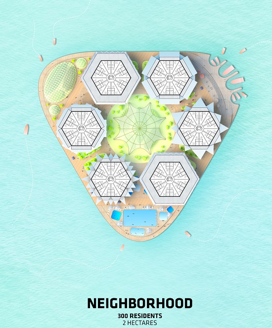 Każda wyspa-osiedle pomieści ok. 300 mieszkańców i zapewni dla nich przestrzeń do pracy, spotkań i codziennych aktywności.