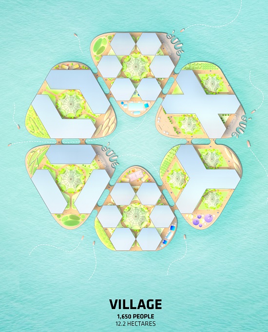 Każda z sześciokątnych wysp grupowana ma być w sześciowyspową wioskę. Każda wioska ma jedną z sześciu specjalizacji: zdrowie, edukacja, kultura, sport, duchowość, agora.