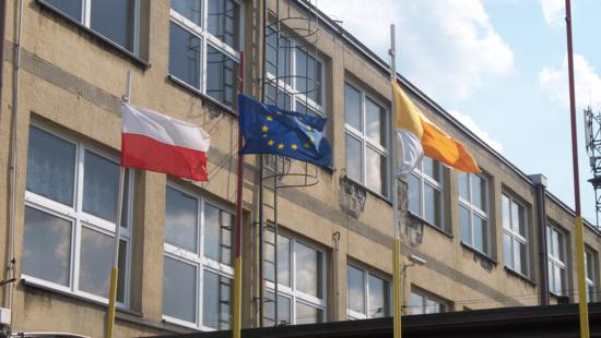 Na masztach na terenie wyżej wymienionej szkoły powiewają trzy flagi: flaga
