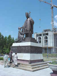 wręcza makietę świątyni. Bałwan z prawej — papież w towarzystwie klęczącego