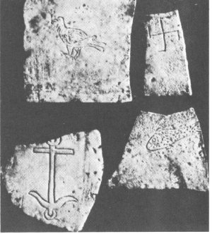 Wczesnochrześcijańskie symbole rzymskie, Katakumby św. Kaliksta (217-222). Początkowo, w czasach rzymskich, to nie krzyż był naczelnym symbolem chrześcijan, lecz właśnie ryba. Krzyż, jako znak chrześcijaństwa, pojawił się dopiero po kilku wiekach. Ryba, jako symbol chrześcijan, przewija się stale przez ich dzieje, aż do dziś (np. zielonoświątkowcy na swych samochodach umieszczają znak ryby) |