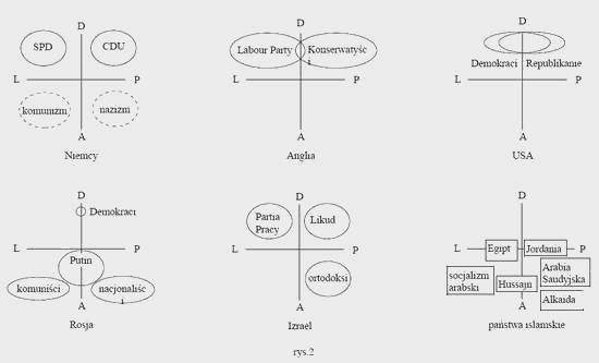głównych ugrupowań politycznych w różnych krajach przedstawiono na rys. 2. Linią przerywaną zaznaczono byłe ugrupowania.