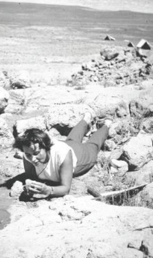 Zofia Kielan-Jaworowska w trakcie zabezpieczania klejem odkrytego gniazda jaj