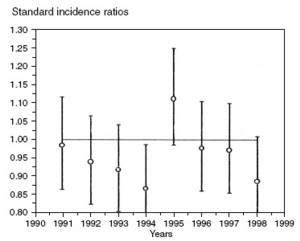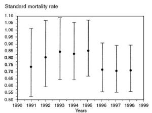 Standardowy współczynnik śmiertelności spowodowanej guzami litymi pośród ratowników w Czarnobylu (czarne kropki). Współczynnik ten okazuje się niższy niż dla całej populacji Rosji, która została użyta jako grupa kontrolna (1.0). Pomiędzy rokiem 1990 a 1999, śmiertelność wśród ratowników była 15-30% niższa niż w całej populacji. (Źródło: Iwanow i inni, 2004)