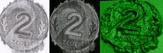 Rys. 1. Obraz wykonany z użyciem monety; od lewej: pozytyw, negatyw, rekonstrukcja kształtu monety, na podstawie obrazu.