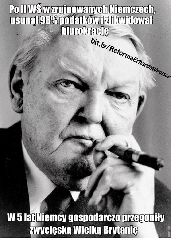 kolportują memy głoszące, jak dokonał się cud: Erhard obciął 98% podatków i w 5 lat wyprzedził Anglię, która była w obozie zwycięzców.