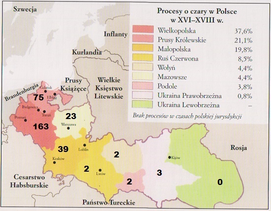 Liczby w poszczególnych dzielnicach odnoszą się do procesów o czary zakończonych wyrokami śmierci. Mapka pochodzi z ww. książki M. Pilaszek. Ziemie wschodnie, gdzie nie było praktycznie żadnych czarownic, obrodziły z kolei w wampiry, które to zjawisko rozwinęło się w Polsce w XVIII w.