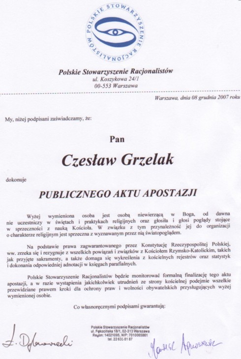 Czesław Grzelak w konsekwentny sposób odwoływał się jednak do kolejnych instytucji, aż z pomocą Helsińskiej Fundacji Praw Człowieka dotarł do Europejskiego Trybunału Praw Człowieka w Strasburgu, gdzie niedługo będzie rozpatrywana jego sprawa. Według ekspertów, praktycznie pewną jest jego wygrana. Będzie to wielka wygrana sprawiedliwości nad dyktatem religijnego integryzmu. By tego dokonać, Czesław Grzelak musiał się wykazać wielkim hartem ducha, uporem i pewnością, że prawda i walka o własne prawa są dużo więcej warte niż konformizm i lekcja obłudy. Każdy z nas wie, ile potrzeba siły woli, by otwarcie występować w obronie swoich racji i odmiennego poglądu — a dotyczy to tylko naszych małych, codziennych spraw. Tym większy zatem szacunek należy się Czesławowi Grzelakowi, który odważył się wystąpić przeciwko Państwu i jego biurokracji. Nie oglądając się na innych, nie szukając rozgłosu, ten niebywale skromny i zrównoważony człowiek w pojedynkę bliski jest dokonania tego, czego nie udało się wywalczyć licznym stowarzyszeniom, partiom politycznym i całej rzeszy niezadowolonych z obecnego stanu rzeczy. Czesław Grzelak jest członkiem PSR. ![]() Fot. Agnieszka Zakrzewicz Akt zbiorowej i publicznej apostazji