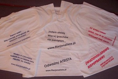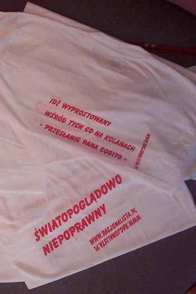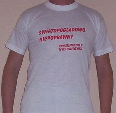 Z przodu krótka i dosadna charakterystyka serwisu Racjonalista z jednej, i jego sympatyka - z drugiej strony. Hasło to jednocześnie wyraża fakt, że społeczeństwo w którym żyjemy nie jest pluralistyczne i wieloświatopoglądowe, gdyż - przykładowo - w Holandii czy Wielkiej Brytanii napis taki byłby pozbawiony głębszego sensu, ponieważ w społeczeństwie prawdziwie pluralistycznym nie ma światopoglądów "niepoprawnych". W Polsce natomiast racjonalizm, świecki humanizm, wolnomyślicielstwo, ateizm czy agnostycyzm są to światopoglądy niepoprawne, gdyż wodzowie Narodu głoszą wszem i wobec, że Polska jest krajem katolickim, nierzadko dodając: "całkowicie katolickim". Racjonalista w takiej koszulce to chodzące zaprzeczenie i publiczne zadanie kłamu takim twierdzeniom...