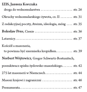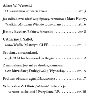 Opis W zimowym „Wolnomularzu Polskim” pochylamy się z uwagą nad wielkimi Polakami i wybitnymi wolnomularzami: Gabrielem Narutowiczem, w 90. rocznicę jego zabójstwa oraz dr. Januszem Korczakiem w 70. rocznicę równie tragicznej śmierci. Brat Janusz zginął wraz z dziećmi z rąk hitlerowców. Niesławną postać jednego z nich, przypomina dr Norbert Wójtowicz. Antybohater jego artykułu, Gregor Schwartz-Bostunitsch przodował w poszukiwaniu spisku żydowsko-masońskiego. Zwolenników spiskowej teorii dziejów nie brakuje i w dzisiejszej Polsce (patrz komentarze na portalu Fronda, które zamieszczamy). Mamy w tym numerze i bardziej współczesne tematy. Jak odbudować w Europie ideał współpracy zastanawia się Marc Henry, nowo wybrany Wielki Mistrz Wielkiej Loży Francji. Jimmy Kessler, zwany „rabinem w fartuszku” mówi o swoich amerykańskich doświadczeniach, a Catherine J. Naltet, nowa Wielka Mistrzyni Wielkiej Żeńskiej Loży Francji, przekazuje swoje masońskie credo.