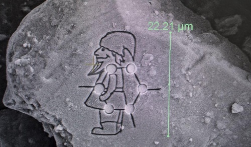 Obraz skrzata na ziarnku piasku utworzono za pomocą wiązki jonowej, która umożliwia bardzo precyzyjne usuwanie materiału. Krasnal ma tylko 20 mikrometrów wzrostu, co oznacza, że trzeba by było postawić 50 takich ludzików, jeden na drugim, aby utworzone przez nie kolumna liczyła 1 mm wysokości.