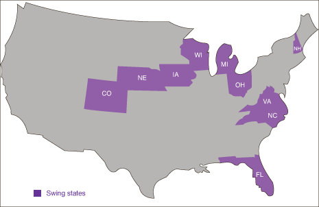 Swing states: Florida (29), Pennsylvania (20), Ohio (18), Michigan (16), North Carolina (15), Virginia (13), Minnesota (10), Wisconsin (10), Colorado (9), Iowa (6), Nevada (6), New Hampshire (4)