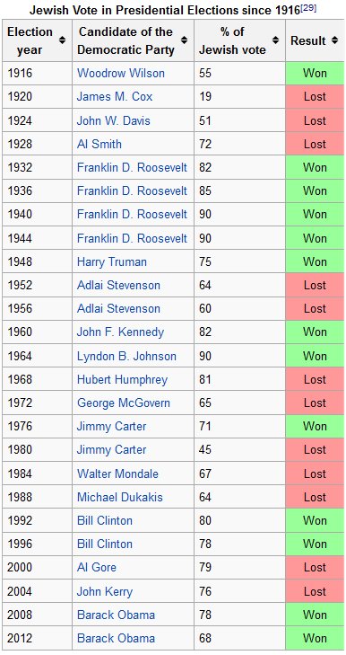 kandydatów na prezydenta USA wyznania katolickiego: Al Smith w 1928, JF. Kennedy w 1960 oraz John Kerry w 2004. Żydzi przytłaczającą większością głosowali na