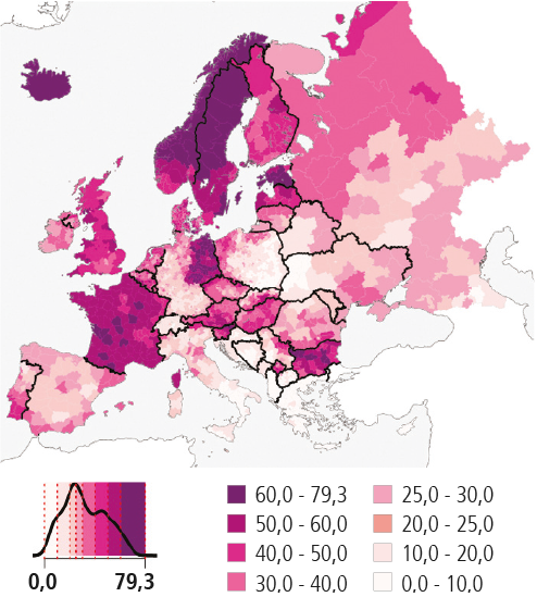 odsetek dzieci rodzi się w związkach pozamałżeńskich w różnych regionach Europy. W rzeczy samej, na mapie tej największą w Europie przestrzeń, gdzie dzieci rodzą