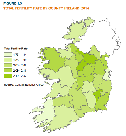 Żadnej zależności pomiędzy odsetkiem dzieci ze związków nieformalnych a ogólnym współczynnikiem dzietności nie widać także na poziomie regionalnym. W Irlandii hrabstwa Carlow czy Mayo mają współczynnik dzietności nawet powyżej