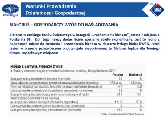Według zestawienia Banku Światowego „Doing Business 2011" w zakresie zakładania nowych przedsiębiorstw Białoruś była na 7 miejscu, Polska — na 68 miejscu. W 2014 było tam 3,5 tys. firm brytyjskich, 2,5 tys. niemieckich i 700 polskich. Mały biznes płacił jedynie 3% podatek przychodowy. BGK chętnie udziela kredytów na wszelkie przedsięwzięcia na Białorusi. Wiecie dlaczego? Ponieważ 100% się zwraca.