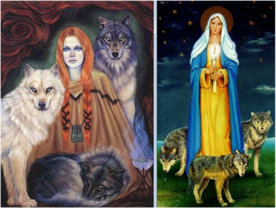 Z lewej: bogini Dziewanna z wilkami, z prawej: Matka Boska Gromniczna z wilkami. Jest to wyjątkowy przykład
