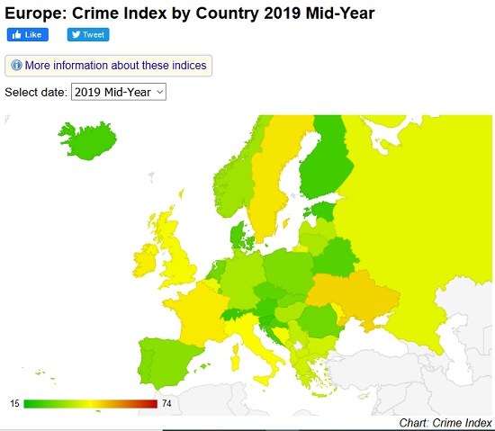 Według serwisu numbeo.com publikującego Crime Index oraz Safety Index, Polska jest najbezpieczniejszym dużym krajem Unii Europejskiej ze wskaźnikiem przestępczości 29,67. Wszystkie ludniejsze od Polski kraje (Niemcy, Francja, Wielka Brytania, Włochy i Hiszpania) mają wyższy współczynnik przestępczości.