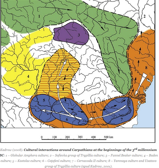 wątki kultury pucharów lejkowatych, amfor kulistych oraz z wywodzącej się z kultury Vinča — kultury ceramiki promienistej.