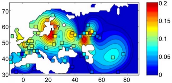Współczesna mapa częstości występowania mutacji Delta32 w CCR5, źródło: The evolutionary history of the CCR5-D32 HIV-resistance mutation,
