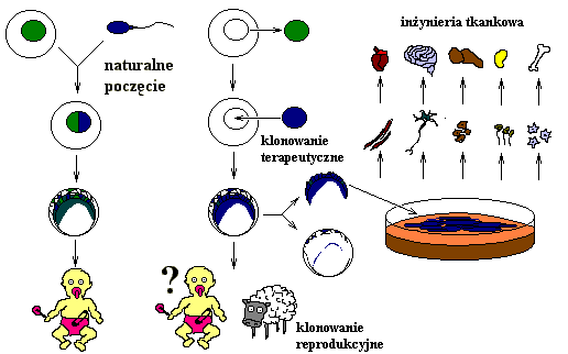 (po lewej) oraz otrzymanie zarodka na drodze klonowania. Klonowanie