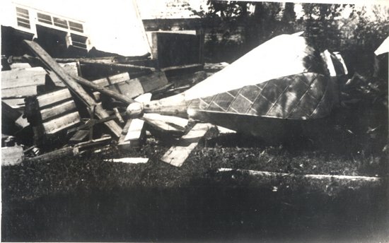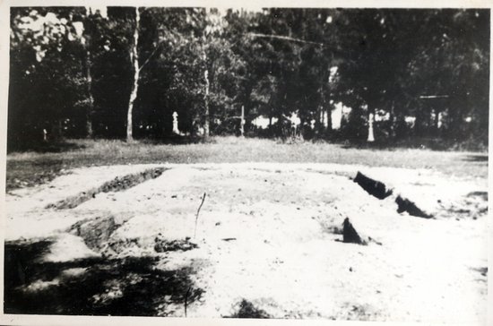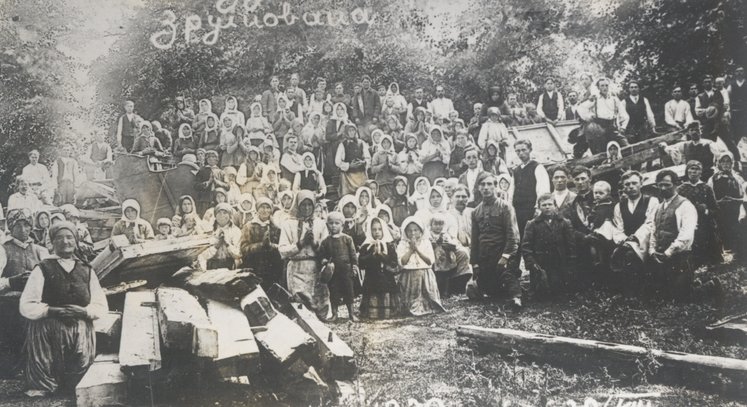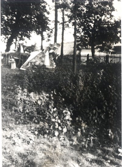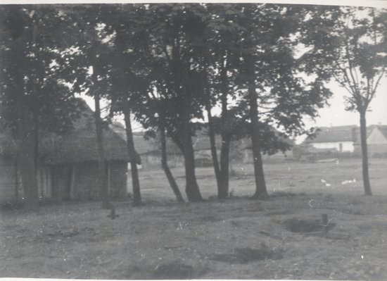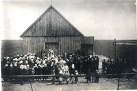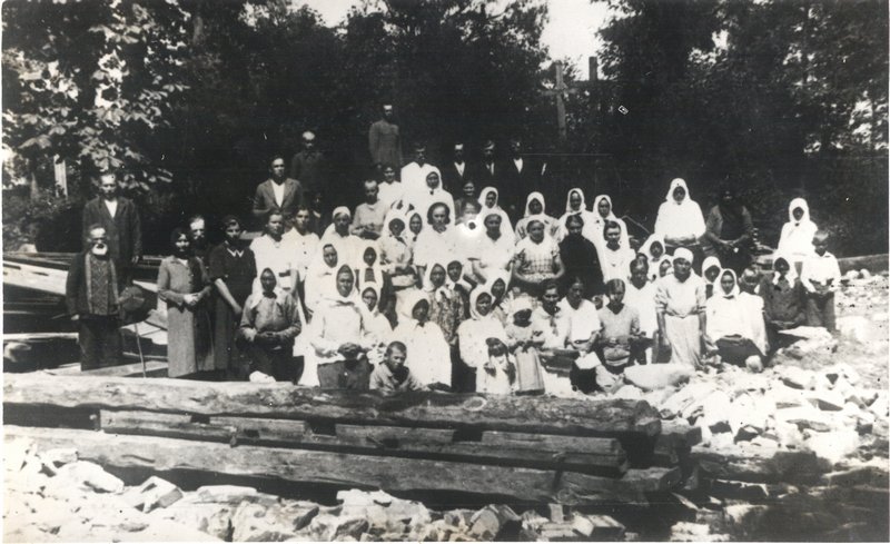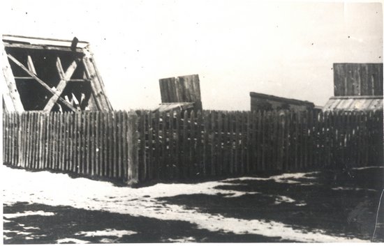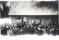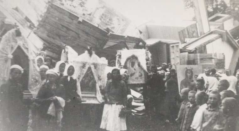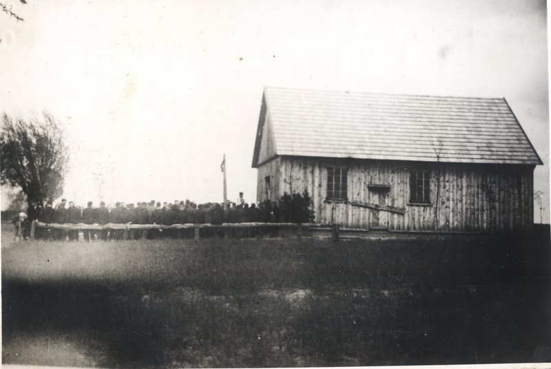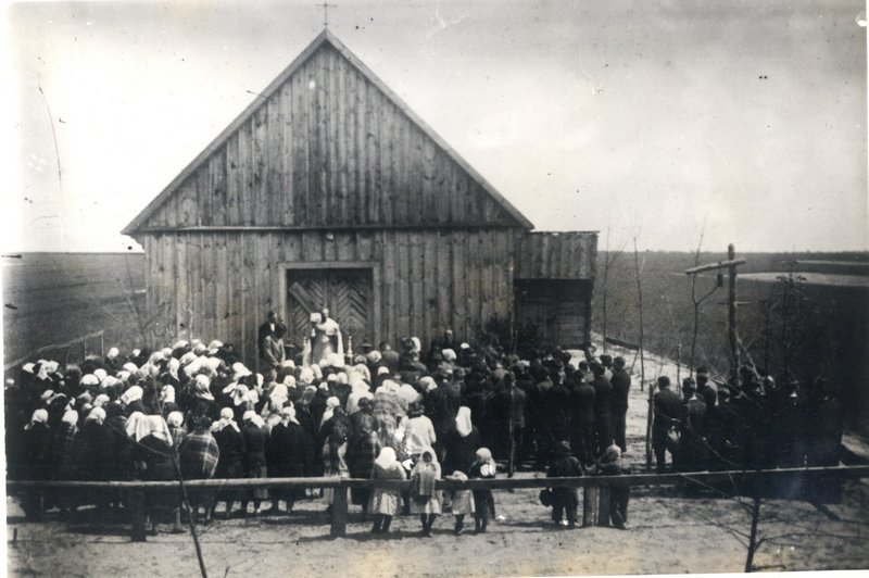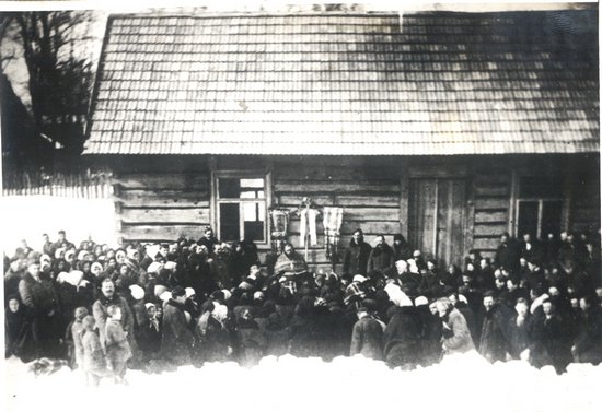 Z lewej wieś Kniażpol; opieczętowany dom modlitwy (23.2.1938). Z prawej — wieś Lipiny-Górne: liturgia przed opieczętowanym domem modlitwy