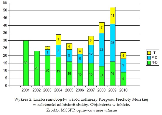ukazuje istotny wzrost liczby samobójstw w USMC zarówno w stosunku do średniej