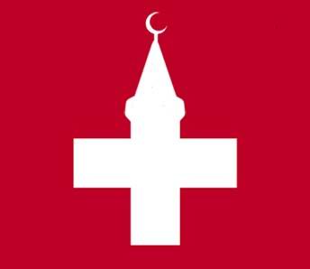przedstawiona jest flaga Szwajcarii naszpikowana czarnymi minaretami