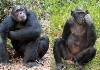 lewej — szympans. Oba gatunki są blisko spokrewnione, ale bonobo jest