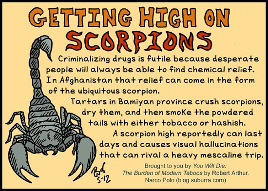 Dochodzimy w tym momencie do bardzo engimatycznej i niewyjaśnionej kwestii — użycia skorpionów w celach mistycznych bądź rekreacyjnych. Otóż znane są nieliczne doniesienia o paleniu sproszkowanych metasom lub gruczołów jadowych skorpionów. Konsultant ONZ, David Macdonald, w swojej książce „Drugs In Afghanistan: Opium, Outlaws and Scorpion Tales" opisuje, jak to wielokrotnie spotykał się z opowieściami o psychoaktywnym zastosowaniu skorpionów. Prym wiodą w tym ludy tatarskie, zamieszkujące afgańską prowincję Bamian. Telsony (segmenty metasomy będące miejscem produkcji i przechowywania jadu) są odcinane żywym skorpionom, suszone, a następnie, po sproszkowaniu, mieszane z tytoniem i palone w postaci skrętów bądź z regionalnej odmiany fajki. Okaleczone zwierzęta przybija się do drzwi. Ta czynność ma przestrzec inne skorpiony przed zbliżaniem się do domu. Istnieje również hipoteza, że jest to również symbol demaskulinizacji, będący odzwierciedleniem usuwania genitaliów przez Tatarów pokonanym wrogom. Zażywanie jadu skorpiona ma sprowadzić na palącego jego siłę i potęgę. Afgańczycy rozróżniają również siłę jadu skorpionów. Nie wiemy, niestety, o jakich gatunkach dokładnie mowa, ale te o ciemnym ubarwieniu są uznawane za „mocniejsze" od jasnych. Ma to odzwierciedlenie w faktach zoogeograficznych — na tym terenie istotnie występuje kilka gatunków o ciemnym ubarwieniu należących do rodziny Buthidae, uznawanej za najbardziej niebezpieczną. Stan „po skorpionie" jest opisywany bardzo różnie; porównuje się go do działania mocnego haszyszu, ale również meksaliny i heroiny. Jeden z użytkowników opisuje, że po wypaleniu sproszkowanej metasomy doświadczył trwającej przez trzy dni sedacji, w czasie której ciężko mu było podnieść powieki. Inni relacjonują bardzo silne halucynacje, trwające również przy otwartych oczach. Podany jest również przykład doświadczonego hinduskiego mistyka (sadhus), który, aby osiągnąć zjednoczenie z wyższymi bytami, regularnie zażywał mieszankę marihuany, opium, bielunia oraz jadu skorpiona i węża.