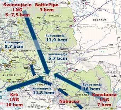 zostać połączone gazociągami: LNG Świnoujscie, wyspa Krk (Chorwacja) oraz Konstanca (Rumunia). W ten sposób Europa Środkowa planuje zespolenie potencjału