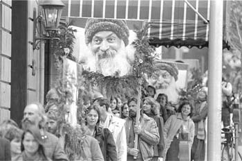 W maju 1981 roku Rajneesh przybył do USA. Osiadł w stanie Oregon, na pustynnym rancho, zakupionym przez swoich amerykańskich uczniów, o powierzchni prawie 400 km kwadratowych. Tam też, gdzie tysiącami zjeżdżali jego zwolennicy, zamierzał przenieść swoje centrum z indyjskiej Poony; zbudować wymarzone miasto - Rajneeshpuram. W ciągu 4 lat pustynne piaski Oregonu zamieniły się w oazę zieleni oraz samowystarczalną wspólnotę o rozmiarach małego miasta z elektrownią i lotniskiem. Przeciętna wieku członków ośrodka wynosiła 34 lata, 64 procent spośród nich miało wyższe wykształcenie, w tym 38 procent — wyższe stopnie naukowe... Guru, dla którego m.in. dobrowolnie i bez żadnego przymusu wznoszono miasto marzeń, pracując niejednokrotnie po kilkanaście godzin dziennie, był znakomitym mówcą, człowiekiem oświeconym, także w zachodnim tego słowa znaczeniu. Rajneesh za pomocą prostego języka wprowadzał zachodniego słuchacza w świat jogi, tantryzmu, zen, taoizmu i sufizmu, wydobywając z nich esencję prawdziwej, wschodniej i zarazem uniwersalnej religijności. Nie propagował jednak żadnego konkretnego systemu religijnego, przede wszystkim nauczał technik medytacji. Wielu Amerykanom bardzo odpowiadał światopogląd i sposób bycia zawsze radosnego guru z Indii, który twierdził, że bogactwo nie stoi na przeszkodzie — sprzyja nawet rozwojowi duchowemu. Rajneesh często prowokował, posługiwał się ironią i dowcipem. Przed wejściem do sali, gdzie odbywały się jego wykłady, widniał napis: "Zostawcie tu buty i umysły". Zarzucano mu, że jak każdy sekciarz i on „prał mózgi". Jego uczniowie to potwierdzają, podkreślając zarazem, iż miało to dla nich zbawienny skutek, bowiem medytacje, których nauczał Osho, skutecznie oczyszczały ich umysły z dogmatów, stereotypów, na których opierają się tradycyjne religie i Kościoły, oraz strachu wpajanego przez kapłanów. Niekonwencjonalny guru, dla którego samo życie było bogiem, odważnie krytykował skostniałe organizacje religijne, nie oszczędzając przy tym także tradycyjnych „świętości", takich jak Mahatma Gandhi, Matka Teresa czy papież. ![]() Podziwiam Franciszka z Asyżu, który jeździł na ośle. Ale było to przecież torturowanie żywego stworzenia. Podróżowanie Rolls-Roycem nie krzywdzi nikogo. Ludzie myślą, że Rolls-Royce kłóci się z uduchowieniem. To nieprawda. W rzeczywistości, to właśnie na furmance trudno jest medytować. Rolls-Royce jest dużo lepszy dla duchowego rozwoju. Kowboje i „pobożni" przeciwko „czerwonym"Gdy mówię, że Bóg jest największym wrogiem religii, to takie twierdzenie szokuje tzw. religijnych ludzi, którzy myślą, że modlitwy do Boga i oddanie mu czci jest religią… Bóg jest największą fikcją jaką kiedykolwiek stworzył człowiek. Bez Boga, Raju, Nirwany, świat staje się przypadkowy, bez znaczenia. Moje zadanie to uczynić cię tak dojrzałym, abyś mógł żyć pięknie i szczęśliwie, bez znaczeń — cała egzystencja nie ma znaczenia. Gdy stajesz się cichy, współbrzmisz z egzystencją, staje się jasne, że nie jest potrzebne żadne znaczenie...