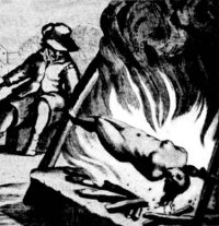 PRÓBA OGNIA I WRZĄTKUPróba ognia zalecana przez autorów „Młota na czarownice" była środkiem dowodowym należącym do średniowiecznych ordaliów. Polegała na tym, że osoba zatrzymana chwytała gołą ręką rozgrzany do czerwoności pręt żelazny. Jeśli po kontakcie z rozgrzanym metalem ręka po trzech dniach dobrze się goiła, był to dowód, że oskarżony nie jest winien zarzucanych mu czynów. Źle gojące się rany wskazywały, że jest winny. [ 3 ] Druga forma tejże próby polegała na przejściu gołymi stopami po rozgrzanych lemieszach albo po płonącym ognisku. W czasie próby wrzątku osoba oskarżona musiała wydobyć z dna kotła wypełnionego wrzącą wodą jakiś przedmiot.