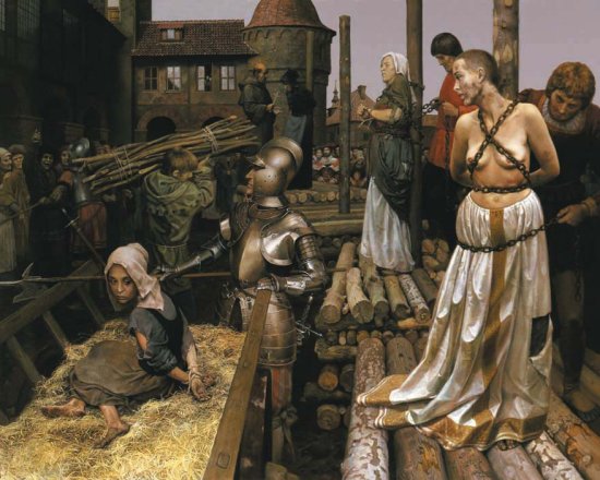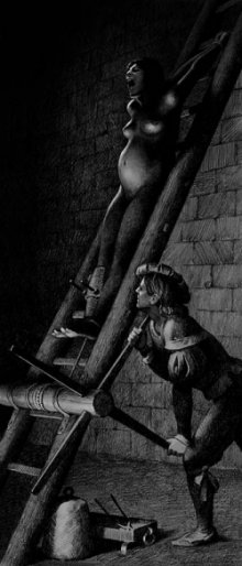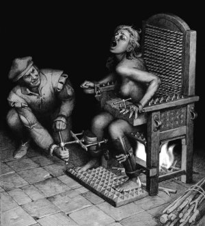W roku 1639 wydana została w Polsce drukiem książka pt. „Czarownica powołana", w której anonimowy autor nie szczędził słów ostrej krytyki skierowanej przeciwko sądownictwu sprawowanemu w odniesieniu do procesów o czary. Książka ta ukazywała i piętnowała liczne nadużycia jakich się wówczas dopuszczano. Pod tym samym tytułem ukazała się w roku 1883 praca profesora Uniwersytetu Jagiellońskiego, Rosenblatta, która stanowiła nie tylko komentarz do wyżej wspomnianego dzieła, ale była również jednym z najwcześniejszych zarysów dziejów procesów czarownic. PRZYZNANIE SIĘ DO WINYConfessio est regina probationem — przyznanie się jest królową dowodów. Sędziowie stawiający oskarżonej zarzut czarostwa dokładali wszelkich starań, by ta przyznała się do zbrodni, jakie rzekomo popełniła. Stosowano w tym celu stawianie podchwytliwych pytań, które miały doprowadzić do udzielania odpowiedzi wskazujących na winę domniemanej czarownicy. Owe pytania charakteryzowały się pozorną logiką i niejednokrotnie bazowały na teologicznych fundamentach. Jeśli oskarżona przyznała się do popełnienia zbrodni czarostwa, wówczas proces się kończył i pozostawało już tylko przeprowadzenie egzekucji przez spalenie na stosie lub powieszenie (Anglia, Ameryka Północna). Jednakże nie zawsze udawało się doprowadzić do tego, by czarownica przyznała się do popełnienia zbrodni, czasami sędziowie musieli sięgać po bardziej radykalne środki. Przyznanie się do zbrodni czarostwa nie stanowiło obligatoryjnego warunku do tego, aby wykonać egzekucję. ![]() * Ilustracje użyte w powyższym tekście pochodzą w większości ze strony Inquisition-art. Tekst stanowi fragment pracy magisterskiej napisanej na UWr pod kierunkiem dra Józefa Koredczuka. Przypisy: [ 1 ] K. S ó j k a - Z i e l i ń s k a, Historia prawa, Warszawa